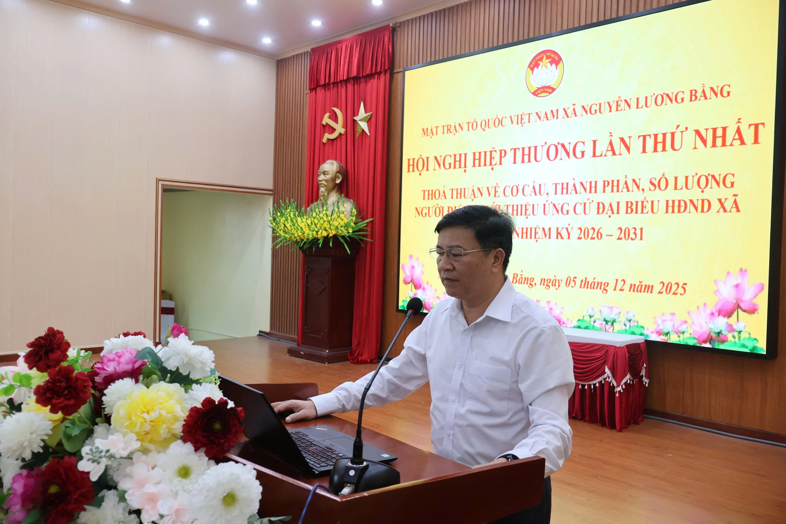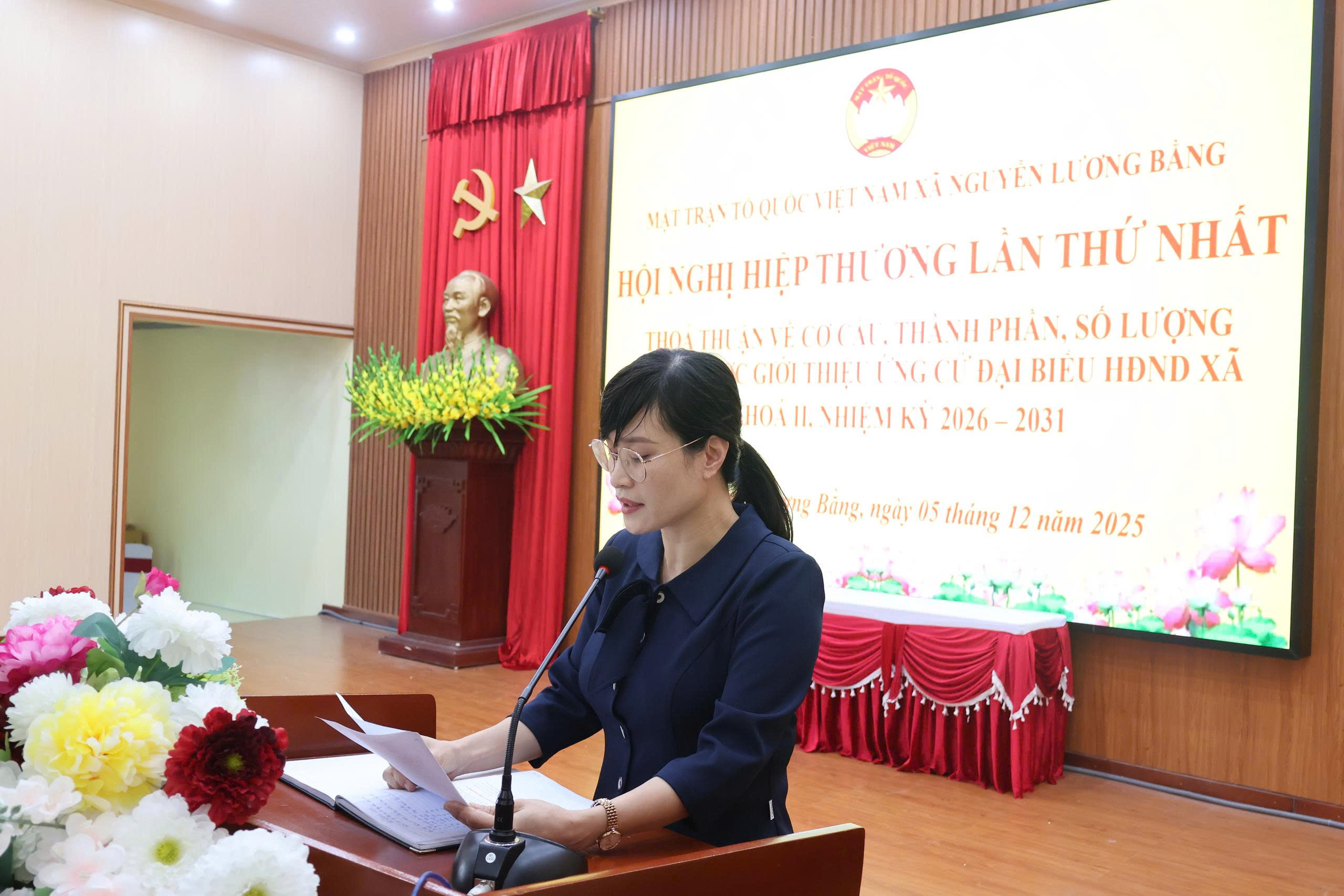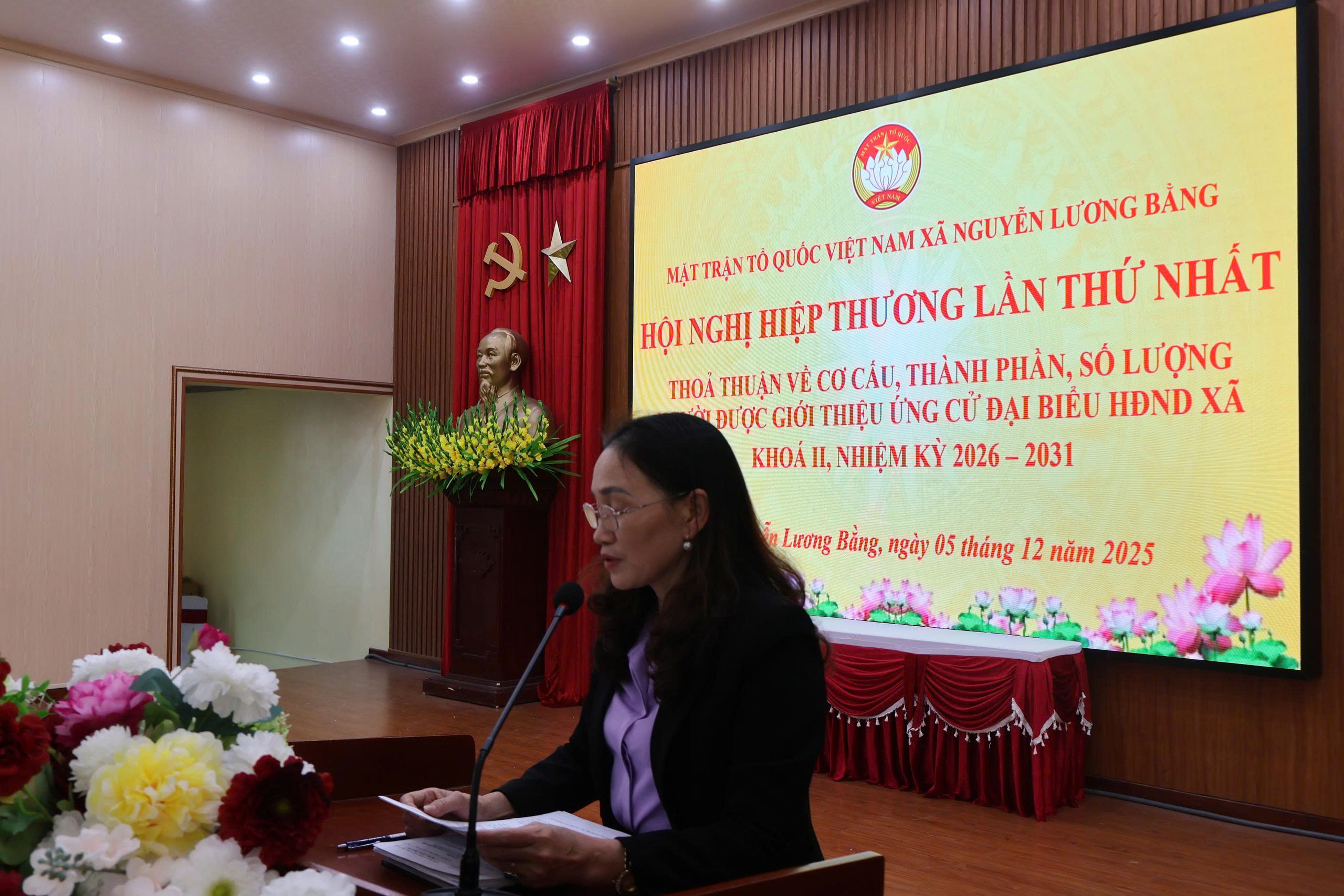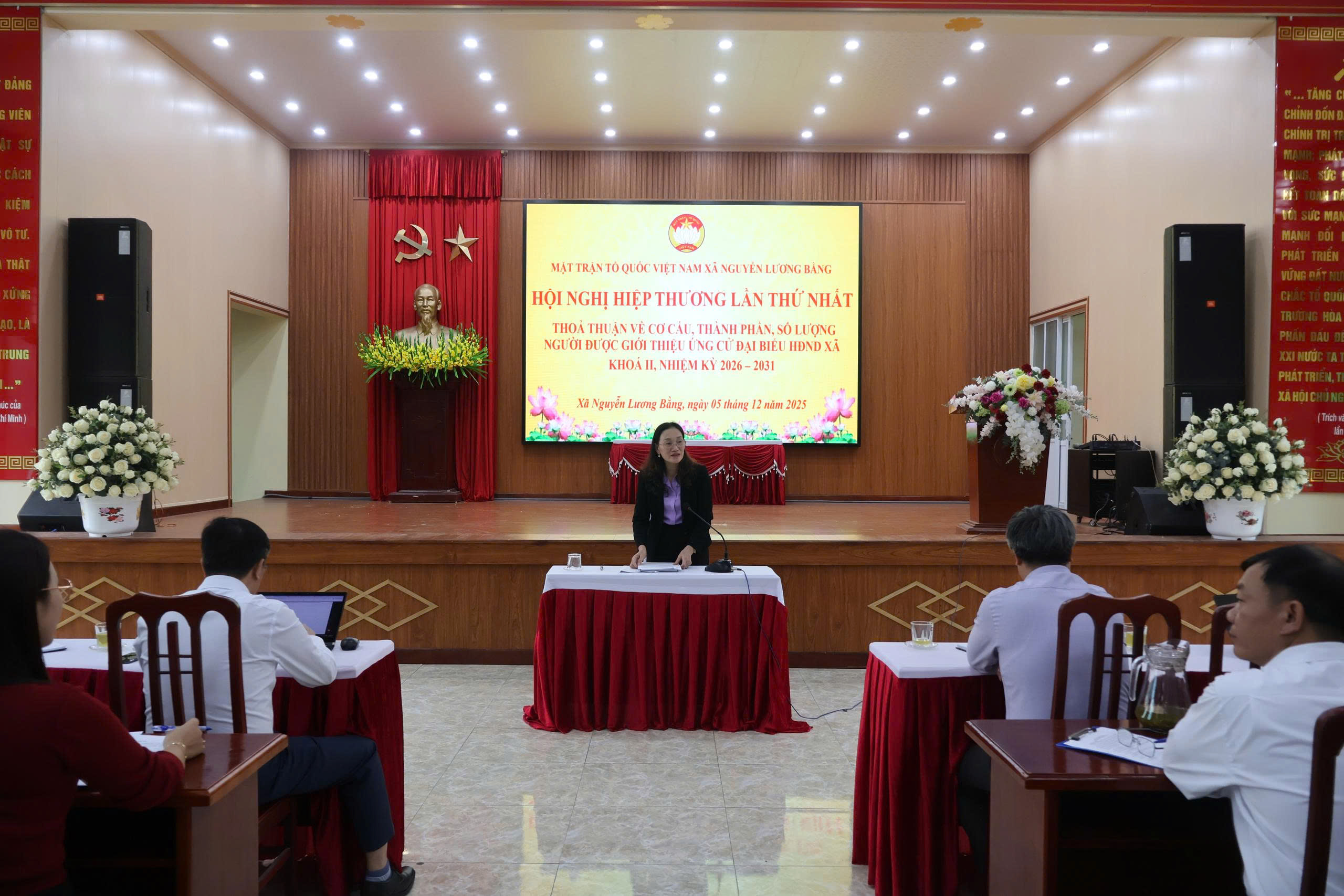Chiều ngày 05/12/2025, tại Nhà văn hóa trung tâm xã, Ban Thường trực Ủy ban MTTQ Việt Nam xã Nguyễn Lương Bằng đã tổ chức Hội nghị hiệp thương lần thứ nhất để thỏa thuận về cơ cấu, thành phần và số lượng người được giới thiệu ứng cử đại biểu HĐND xã, nhiệm kỳ 2026 - 2031. Hội nghị đã giới thiệu và cử đồng chí Bùi Thị Nga, Chủ tịch Ủy ban MTTQ xã chủ trì hội nghị.