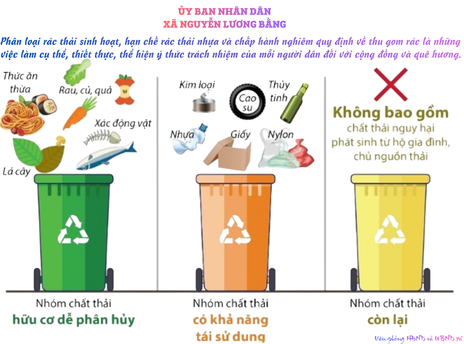 - Phân loại rác thải sinh hoạt, hạn chế rác thải nhựa và chấp hành nghiêm quy định về thu gom rác là những việc làm cụ thể, thiết thực, thể hiện ý thức trách nhiệm của mỗi người dân đối với cộng đồng và quê hương. UBND xã Nguyễn Lương Bằng mong muốn Nhân dân tiếp tục đồng hành cùng chính quyền địa phương, tích cực hưởng ứng các phong trào bảo vệ môi trường, xây dựng nếp sống văn minh, góp phần đưa xã Nguyễn Lương Bằng trở thành địa phương xanh - sạch - đẹp - văn minh - đáng sống.