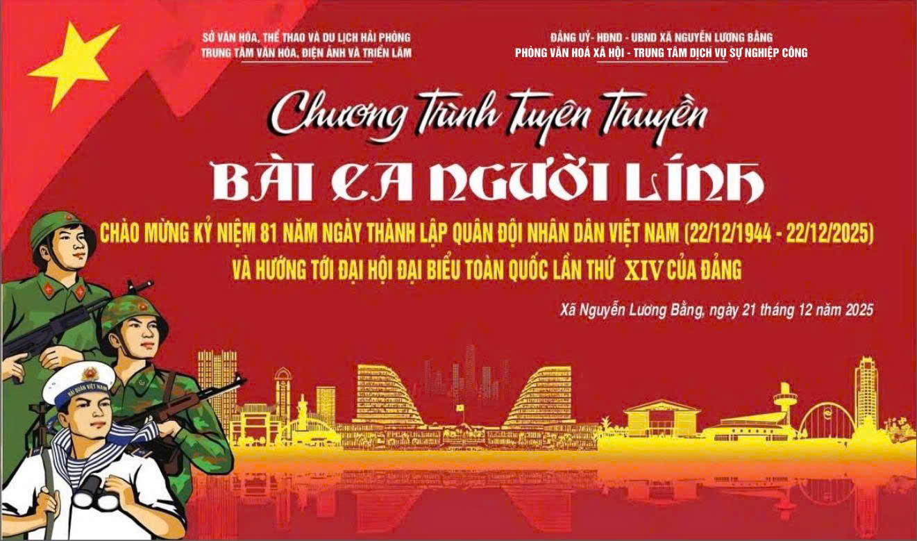 Nhân dịp kỷ niệm kỷ niệm 79 năm Ngày Toàn quốc Kháng chiến (19/12/1946 - 19/12/2025); 81 năm Ngày thành lập Quân đội nhân dân Việt Nam (22/12/1944 - 22/12/2025); 36 năm Ngày hội Quốc phòng toàn dân( 22/12/1989-22/12/2025); Chào mừng thành công Đại hội đại biểu Đảng bộ xã lần thứ I, nhiệm kỳ 2025 - 2030, Đại hội đại biểu Đảng bộ thành phố Hải Phòng lần thứ I, nhiệm kỳ 2025 - 2030 tiến tới Đại hội đại biểu toàn quốc lần thứ XIV của Đảng, Phòng Văn hóa - Xã hội, Trung tâm Dịch vụ sự nghiệp công xã phối hợp với Trung tâm Văn hoá, Điện ảnh và Triển lãm thành phố Hải Phòng tổ chức Chương trình giao lưu văn nghệ tuyên truyền với chủ đề: “Bài ca người lính”.