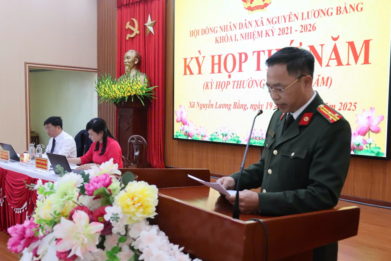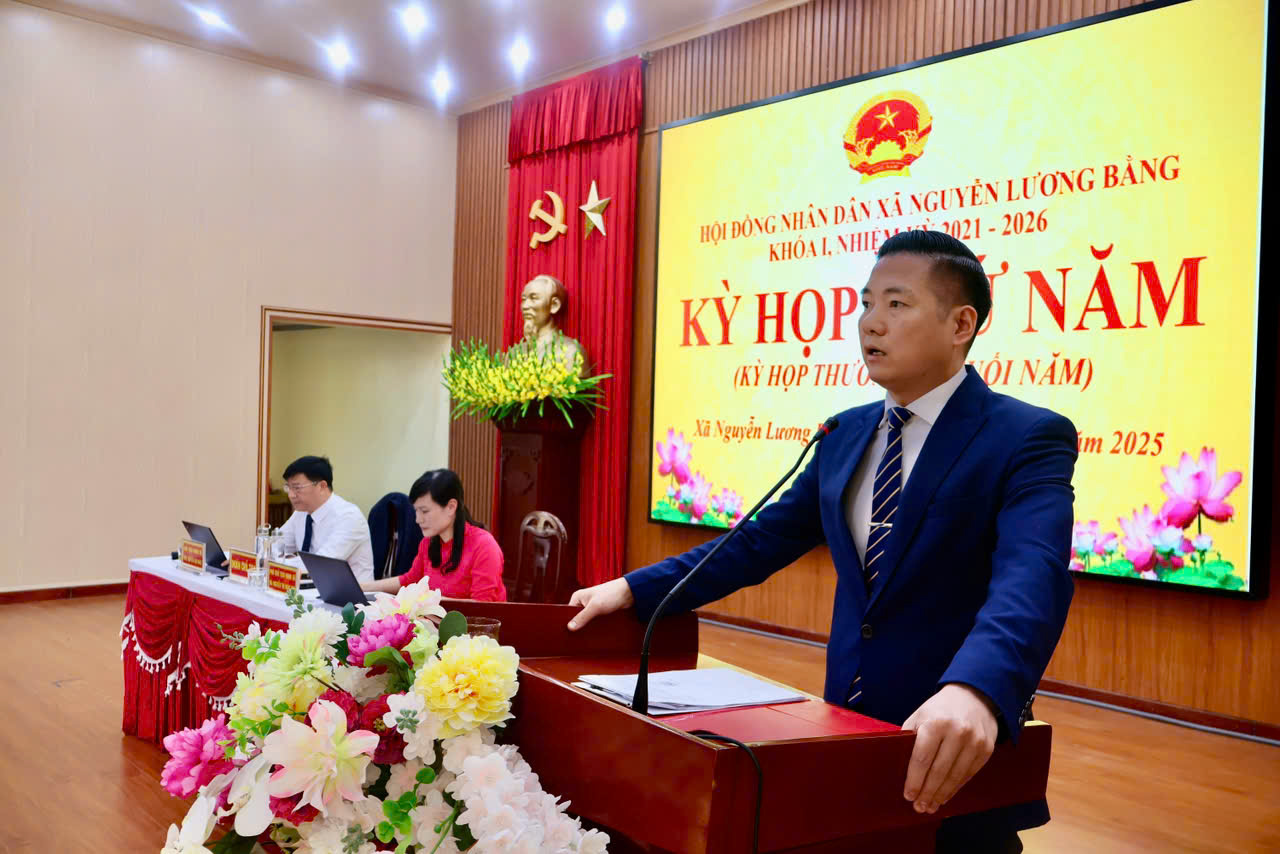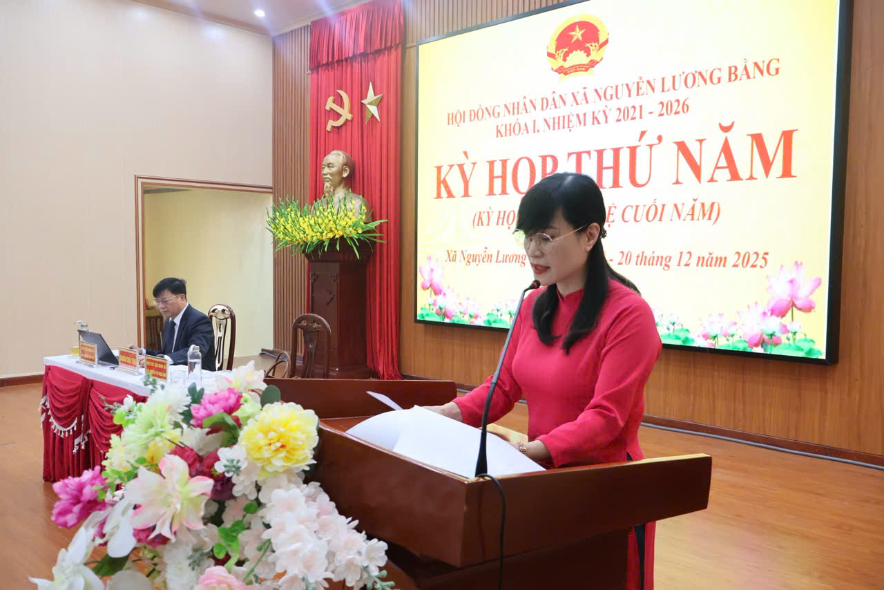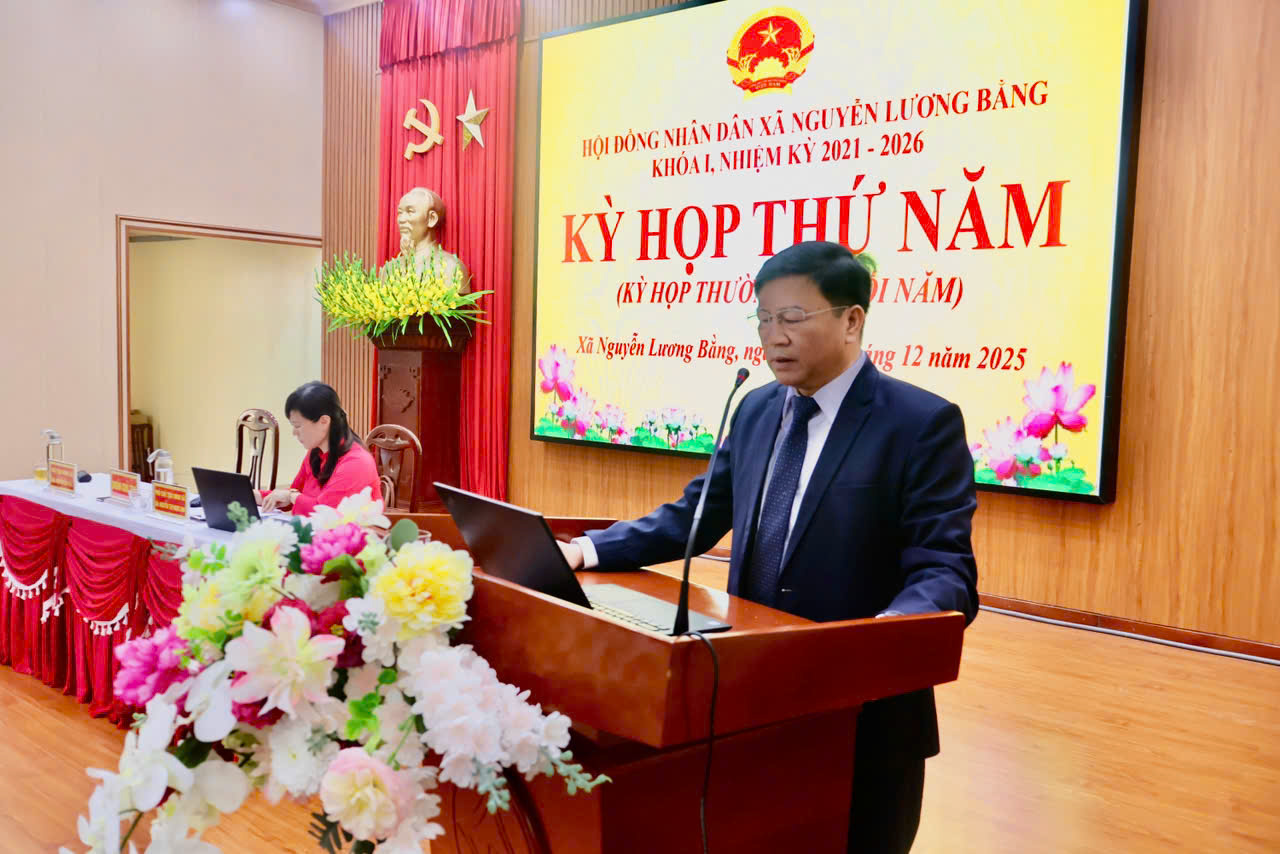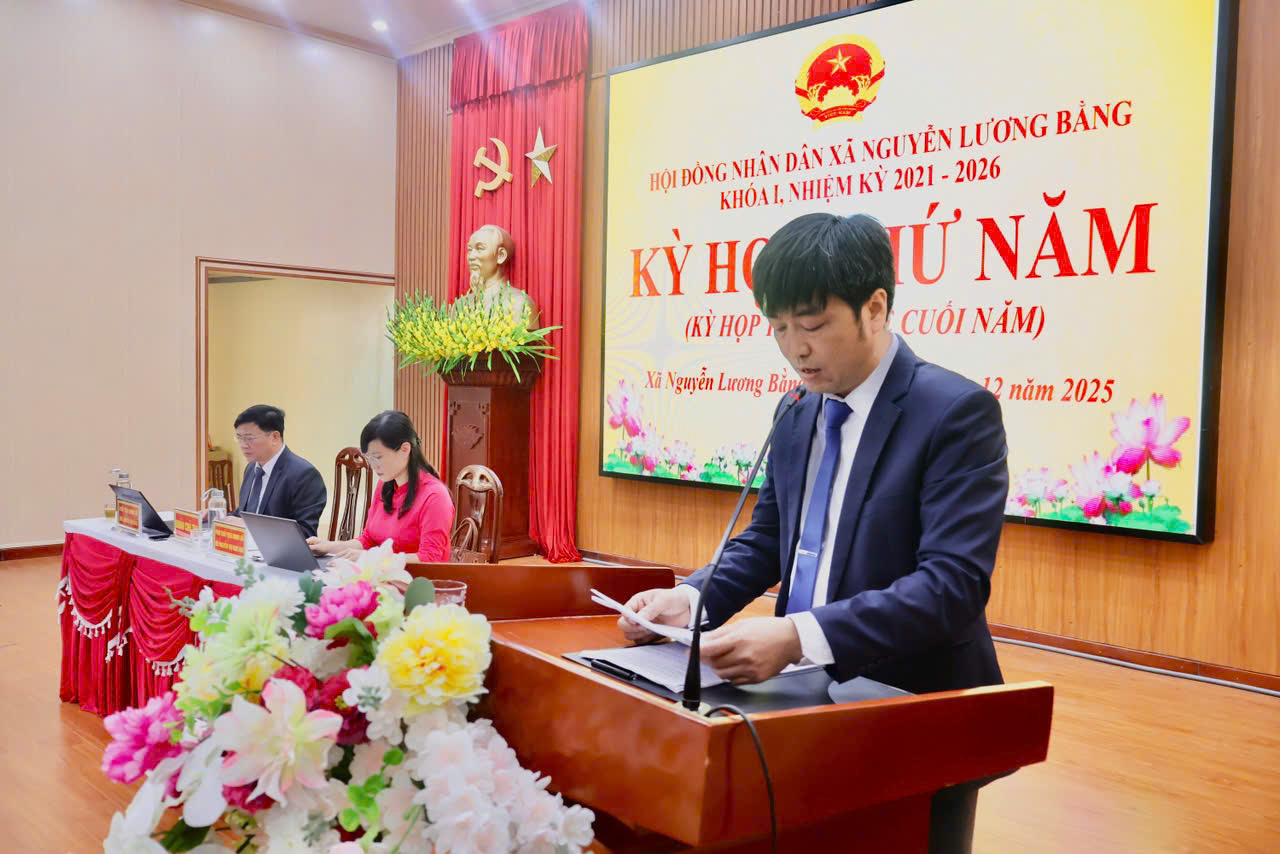 Với tinh thần làm việc khẩn trương, nghiêm túc, dân chủ, kỳ họp đã thống nhất thông qua 6 nghị quyết, trọng tâm là: Nghị quyết về kết quả thực hiện nhiệm vụ phát triển kinh tế - xã hội năm 2025; Kế hoạch và giải pháp thực hiện các nhiệm vụ phát triển kinh tế - xã hội năm 2026. Nghị quyết về tình hình thực hiện thu chi ngân sách xã năm 2025. Nghị quyết về kết quả thực hiện kế hoạch đầu tư công năm 2025 và kế hoạch đầu tư công trung hạn 2021-2025; điều chỉnh kế hoạch đầu tư công trung hạn giai đoạn 2021-2025 và kế hoạch đầu tư công năm 2025. Nghị quyết thông qua dự kiến kế hoạch đầu tư công năm 2026. Nghị quyết về việc giao biên chế, số lượng người làm việc, hợp đồng lao động trong cơ quan, tổ chức hành chính nhà nước và các đơn vị sự nghiệp công lập thuộc xã Nguyễn Lương Bằng năm 2026. Nghị quyết về ban hành Quy chế làm việc của Hội đồng nhân dân xã Nguyễn Lương Bằng (Sửa đổi theo quy chế mẫu của Uỷ ban Thường vụ Quốc hội ban hành).