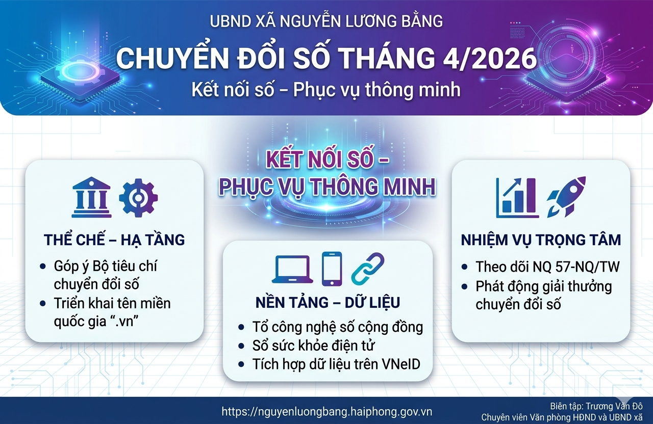 Những kết quả đạt được trong tháng 4/2026 tiếp tục khẳng định quyết tâm chính trị cao của Đảng bộ, chính quyền và Nhân dân xã Nguyễn Lương Bằng trong việc triển khai chuyển đổi số toàn diện. Từ nhận thức đến hành động, từ cơ chế đến thực tiễn, chuyển đổi số đang từng bước thấm sâu vào mọi lĩnh vực của đời sống xã hội tại địa phương.