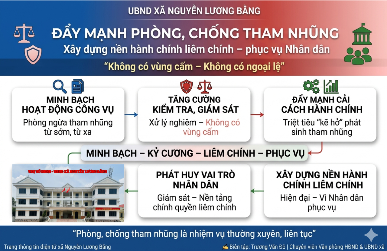 Trong tiến trình xây dựng Nhà nước pháp quyền xã hội chủ nghĩa, công tác phòng, chống tham nhũng, tiêu cực được xác định là nhiệm vụ trọng tâm, thường xuyên và lâu dài. Đối với xã Nguyễn Lương Bằng, đây không chỉ là yêu cầu về chính trị mà còn là giải pháp then chốt nhằm nâng cao hiệu lực, hiệu quả quản lý nhà nước, củng cố niềm tin của Nhân dân, đồng thời tạo nền tảng vững chắc cho phát triển kinh tế - xã hội bền vững.