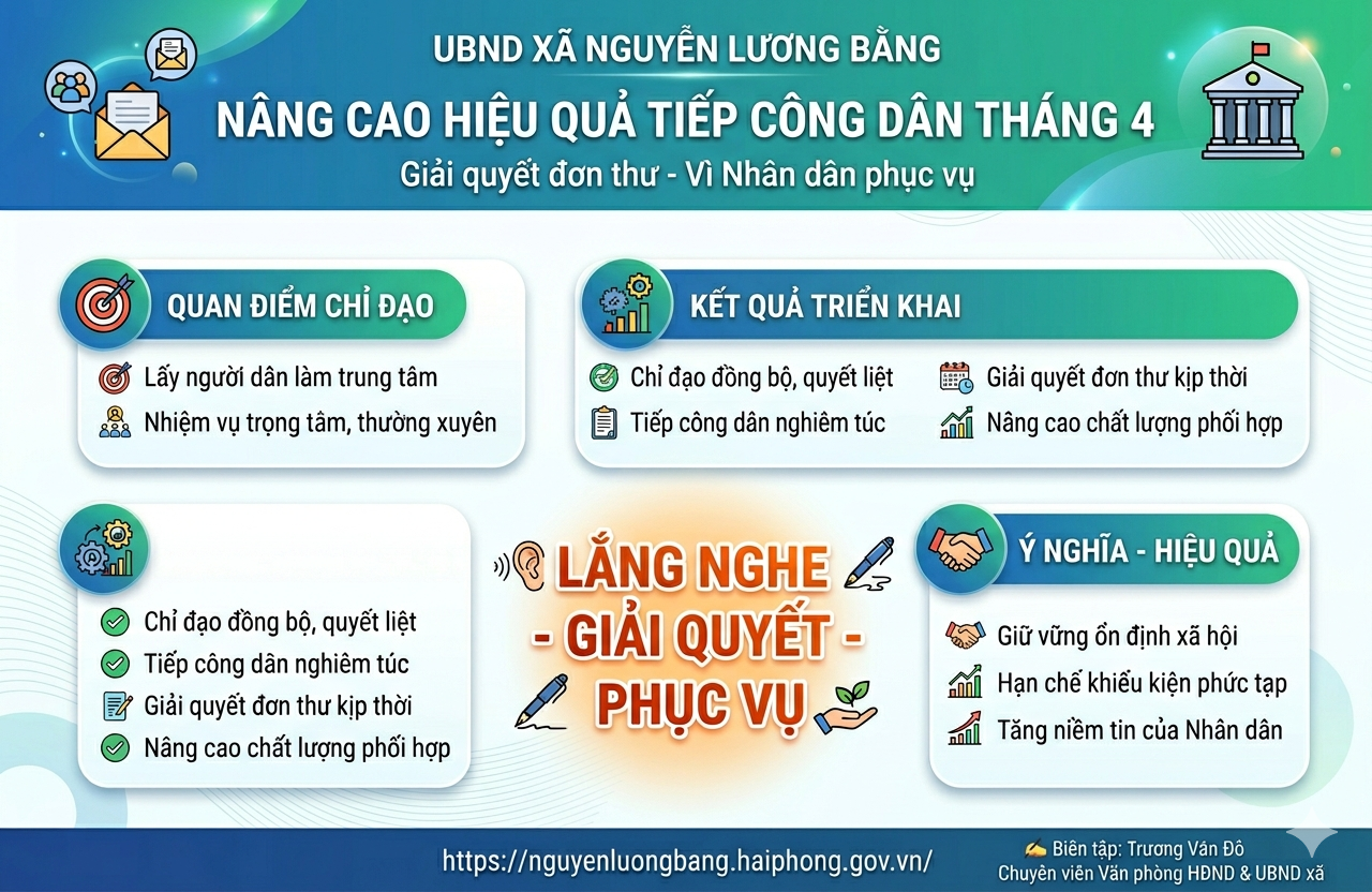 Thực hiện nghiêm túc quy định của pháp luật về tiếp công dân, Chủ tịch Ủy ban nhân dân xã Nguyễn Lương Bằng đã duy trì lịch tiếp công dân định kỳ vào ngày thứ Tư hằng tuần. Trong thời gian từ ngày 20/3/2026 đến ngày 20/4/2026, Chủ tịch UBND xã đã tổ chức 04 kỳ tiếp công dân định kỳ, tương đương 08 buổi tiếp.