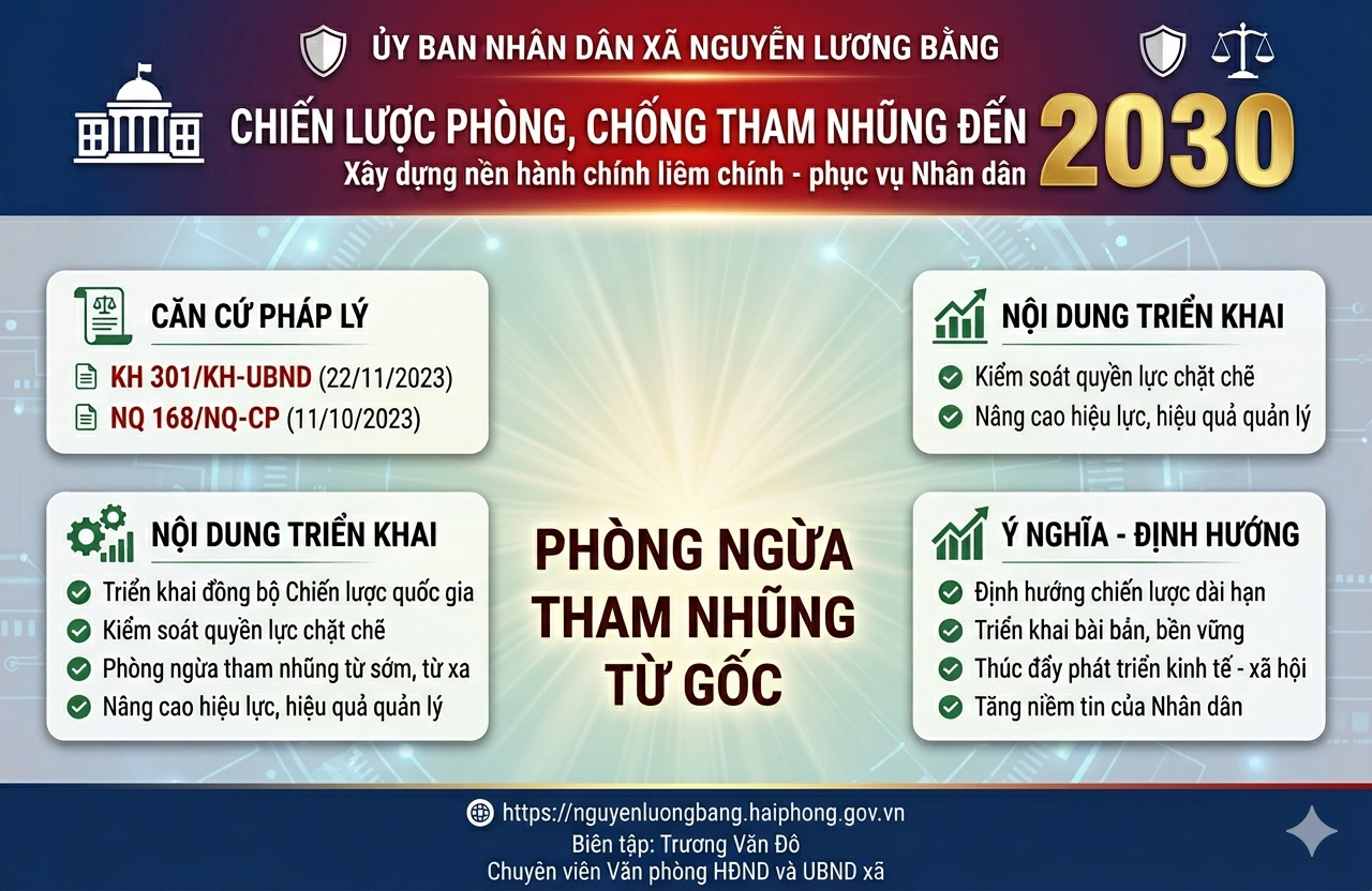 Thực hiện Kế hoạch số 301/KH-UBND ngày 22/11/2023 của Ủy ban nhân dân thành phố về triển khai Nghị quyết số 168/NQ-CP ngày 11/10/2023 của Chính phủ ban hành Chiến lược quốc gia phòng, chống tham nhũng, tiêu cực đến năm 2030, xã Nguyễn Lương Bằng đã chủ động, nghiêm túc và đồng bộ triển khai nhiều giải pháp trọng tâm, thể hiện rõ quyết tâm chính trị trong xây dựng bộ máy chính quyền trong sạch, vững mạnh, hoạt động hiệu lực, hiệu quả.