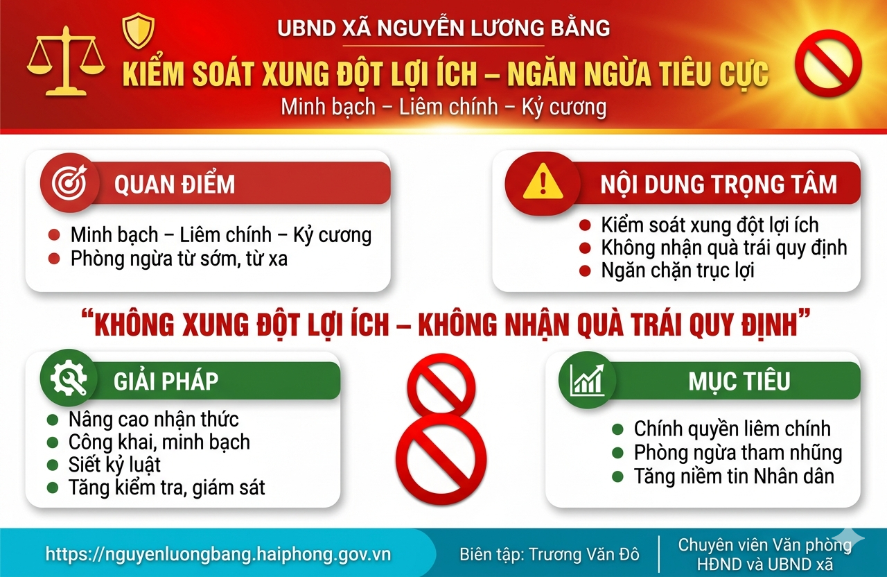 Trong tiến trình xây dựng nền hành chính hiện đại, minh bạch và phục vụ, việc kiểm soát xung đột lợi ích và thực hiện nghiêm các quy định về tặng, nhận quà tặng có ý nghĩa đặc biệt quan trọng. Nhận thức rõ điều đó, Ủy ban nhân dân xã Nguyễn Lương Bằng đã và đang triển khai đồng bộ, quyết liệt các giải pháp nhằm phòng ngừa tham nhũng, tiêu cực ngay từ gốc, góp phần củng cố niềm tin của Nhân dân đối với chính quyền địa phương.
