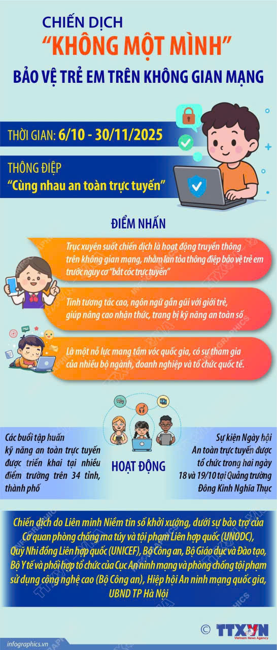 Với sự tham gia của Bộ Công an, UNICEF và các tổ chức quốc tế, chiến dịch “Không một mình” kêu gọi cộng đồng chung tay bảo vệ trẻ em trước nguy cơ bị lừa đảo, dụ dỗ và thao túng trên không gian mạng.