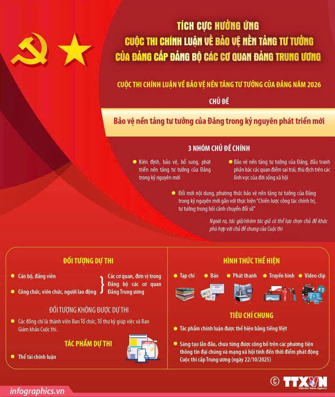 Cuộc thi chính luận về bảo vệ nền tảng tư tưởng của Đảng năm 2026 có chủ đề “Bảo vệ nền tảng tư tưởng của Đảng trong kỷ nguyên phát triển mới” với 3 nhóm chủ đề chính: Kiên định, bảo vệ, bổ sung, phát triển nền tảng tư tưởng của Đảng trong kỷ nguyên mới; Bảo vệ nền tảng tư tưởng của Đảng, đấu tranh phản bác các quan điểm sai trái, thù địch trên các lĩnh vực của đời sống xã hội; Đổi mới nội dung, phương thức bảo vệ nền tảng tư tưởng của Đảng trong kỷ nguyên mới gắn với thực hiện “Chiến lược công tác chính trị, tư tưởng trong bối cảnh chuyển đổi số”.