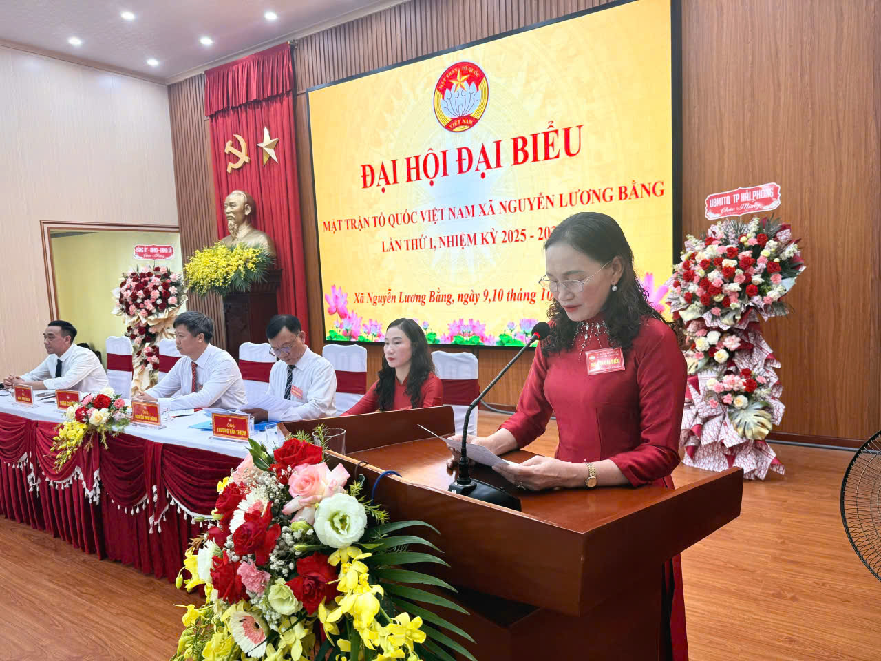 Tại Phiên làm việc chính thức, Đại hội đã hiệp thương cử 57 ông, bà là ủy viên Ủy ban MTTQ xã Nguyễn Lương Bằng khóa I, nhiệm kỳ 2025- 2030; 01 đại biểu chính thức dự Đại hội đại biểu MTTQ Việt Nam thành phố Hải Phòng, lần thứ I, nhiệm kỳ 2025 - 2030; hiệp thương cử bà Bùi Thị Nga giữ chức Chủ tịch và 5 ông, bà giữ chức Phó Chủ tịch Ủy ban MTTQ Việt Nam xã Nguyễn Lương Bằng khóa I, nhiệm kỳ 2025-2030.