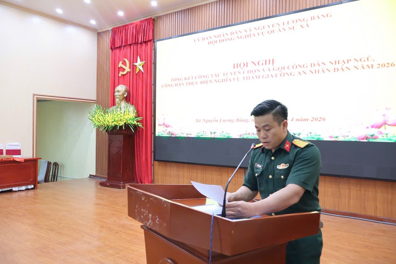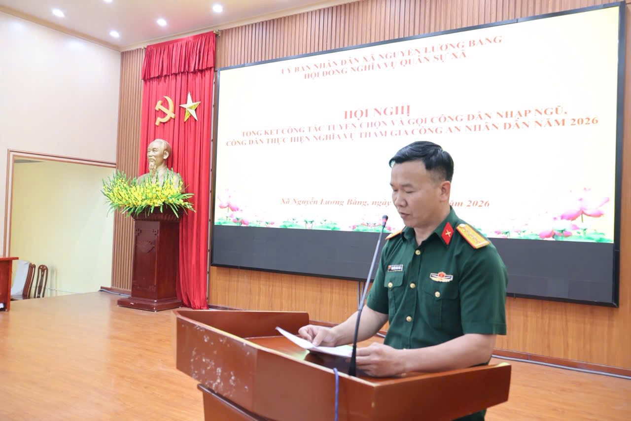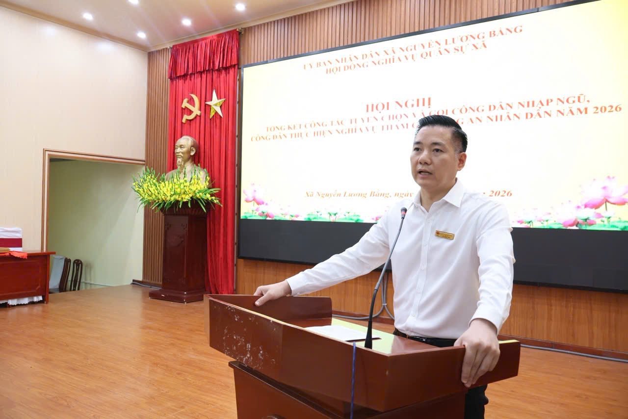 Tại hội nghị, đồng chí Thiếu tá Nguyễn Thế Dũng, Phó Chỉ huy trưởng Ban Chỉ huy Quân sự xã đã trình bày báo cáo tổng kết công tác tuyển quân năm 2026, phương hướng nhiệm vụ năm 2027 Tại hội nghị, đồng chí Thiếu tá Nguyễn Thế Dũng, Phó Chỉ huy trưởng Ban Chỉ huy Quân sự xã đã trình bày báo cáo tổng kết công tác tuyển quân năm 2026, phương hướng nhiệm vụ năm 2027. Báo cáo khẳng định: Năm 2026, công tác tuyển chọn và gọi công dân nhập ngũ, thực hiện nghĩa vụ tham gia Công an nhân dân trên địa bàn xã Nguyễn Lương Bằng đã được triển khai đồng bộ, chặt chẽ và đạt nhiều kết quả tích cực. Ngay từ đầu năm, Đảng ủy, Hội đồng nhân dân, Ủy ban nhân dân và Hội đồng Nghĩa vụ quân sự xã đã tập trung lãnh đạo, chỉ đạo quyết liệt. Công tác tuyên truyền Luật Nghĩa vụ quân sự và Luật Công an nhân dân được đẩy mạnh sâu rộng, góp phần nâng cao nhận thức, trách nhiệm của thanh niên và nhân dân trong thực hiện nghĩa vụ bảo vệ Tổ quốc.
