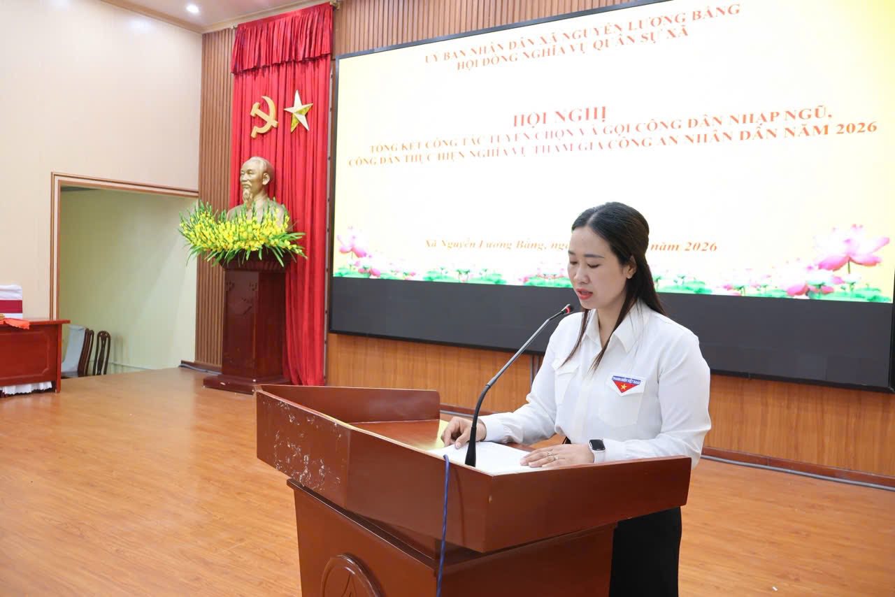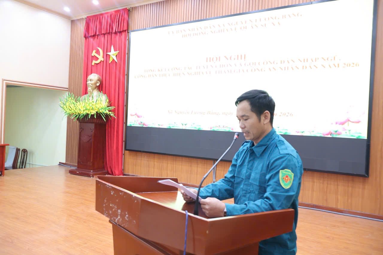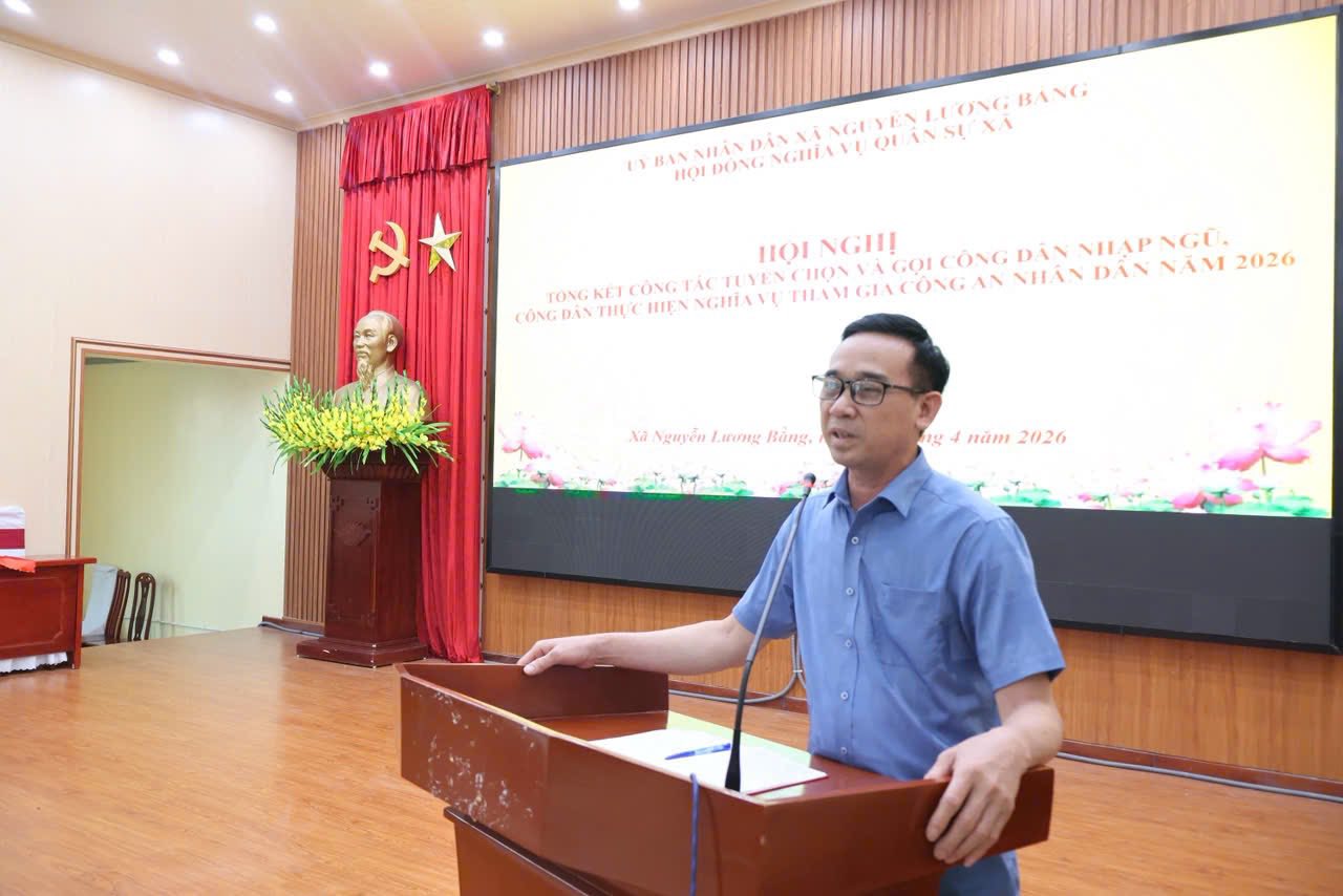 Tại hội nghị, đồng chí Thiếu tá Nguyễn Thế Dũng, Phó Chỉ huy trưởng Ban Chỉ huy Quân sự xã đã trình bày báo cáo tổng kết công tác tuyển quân năm 2026, phương hướng nhiệm vụ năm 2027 Tại hội nghị, đồng chí Thiếu tá Nguyễn Thế Dũng, Phó Chỉ huy trưởng Ban Chỉ huy Quân sự xã đã trình bày báo cáo tổng kết công tác tuyển quân năm 2026, phương hướng nhiệm vụ năm 2027. Báo cáo khẳng định: Năm 2026, công tác tuyển chọn và gọi công dân nhập ngũ, thực hiện nghĩa vụ tham gia Công an nhân dân trên địa bàn xã Nguyễn Lương Bằng đã được triển khai đồng bộ, chặt chẽ và đạt nhiều kết quả tích cực. Ngay từ đầu năm, Đảng ủy, Hội đồng nhân dân, Ủy ban nhân dân và Hội đồng Nghĩa vụ quân sự xã đã tập trung lãnh đạo, chỉ đạo quyết liệt. Công tác tuyên truyền Luật Nghĩa vụ quân sự và Luật Công an nhân dân được đẩy mạnh sâu rộng, góp phần nâng cao nhận thức, trách nhiệm của thanh niên và nhân dân trong thực hiện nghĩa vụ bảo vệ Tổ quốc.