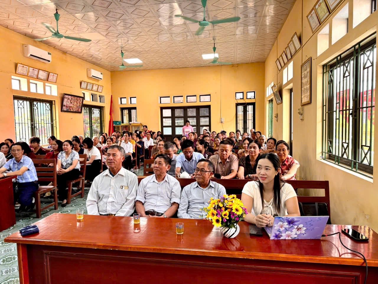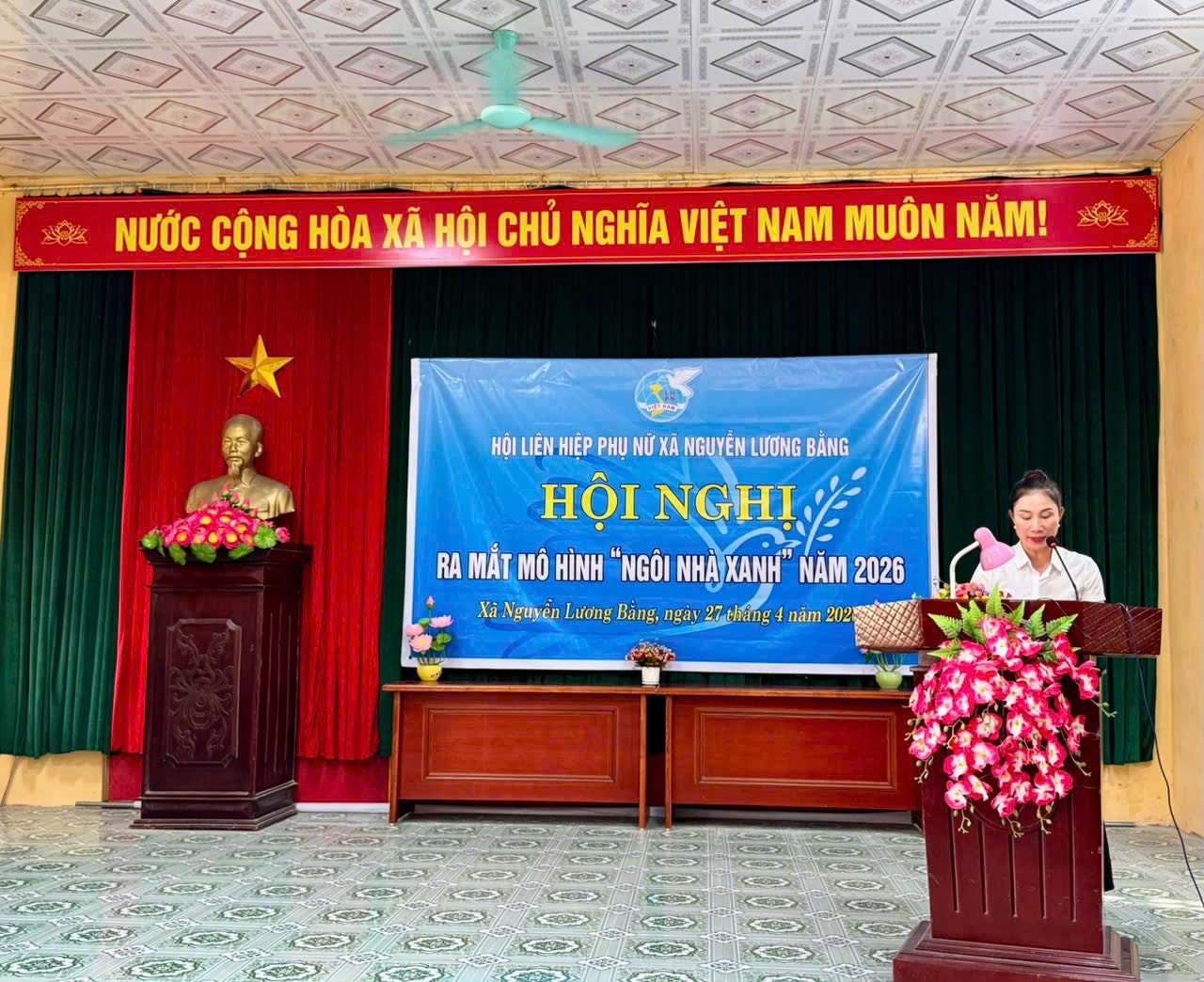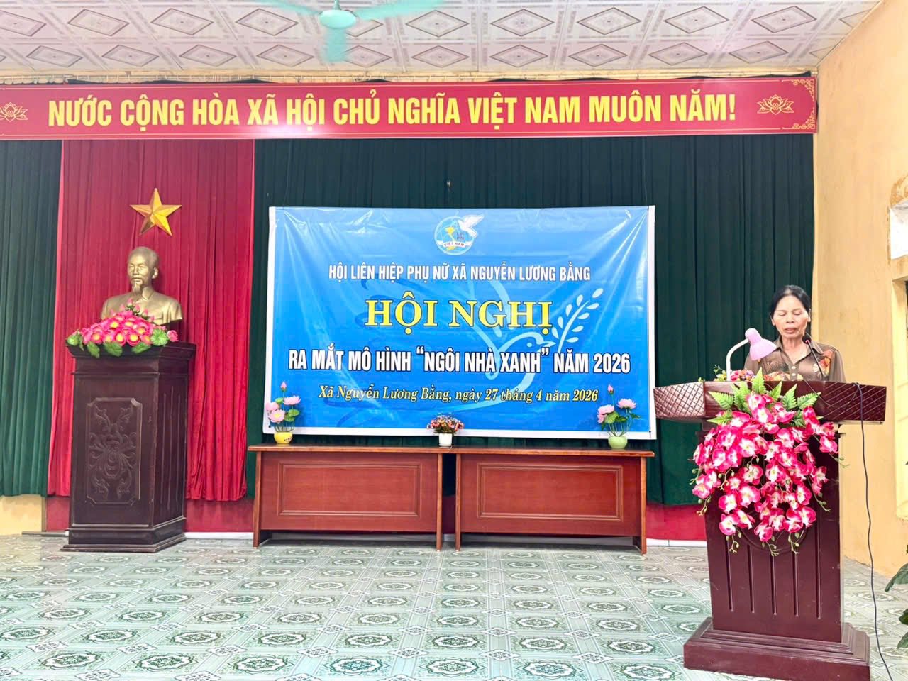 Quang cảnh hội nghị Thực hiện phong trào thi đua xây dựng nông thôn mới nâng cao, hướng tới xây dựng môi trường sống sáng – xanh – sạch – đẹp, đồng thời thiết thực hưởng ứng cuộc vận động hạn chế rác thải nhựa, bảo vệ môi trường và ứng phó với biến đổi khí hậu. Chiều ngày 27/04/2026 tại nhà văn hóa thôn Đào Lâm, Hội Liên hiệp Phụ nữ xã Nguyễn Lương Bằng tổ chức Hội nghị ra mắt mô hình “Ngôi nhà xanh”. Đây là hoạt động có ý nghĩa thiết thực, thể hiện vai trò, trách nhiệm của tổ chức Hội trong việc chung tay cùng cấp ủy, chính quyền và nhân dân xây dựng địa phương ngày càng văn minh, phát triển bền vững.