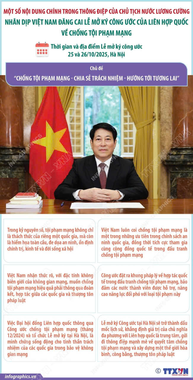 Trong Thông điệp nhân dịp Việt Nam đăng cai lễ mở ký Công ước của Liên hợp quốc về chống tội phạm mạng ngày 25 và 26/10/2025 tại Hà Nội, Chủ tịch nước Lương Cường nhấn mạnh: Công ước đặt ra khung pháp lý về hợp tác quốc tế trong đấu tranh chống tội phạm mạng, bảo đảm các nước thành viên, đặc biệt là các quốc gia đang phát triển, các quốc gia dễ bị tổn thương, được hỗ trợ, nâng cao năng lực đối phó với loại tội phạm này. Việc Đại hội đồng Liên hợp quốc thông qua Công ước chống tội phạm mạng (tháng 12/2024) và tổ chức Lễ mở ký tại Hà Nội, là minh chứng sống động cho tinh thần trách nhiệm của các quốc gia trong bảo vệ không gian mạng - tài sản chung của toàn nhân loại.