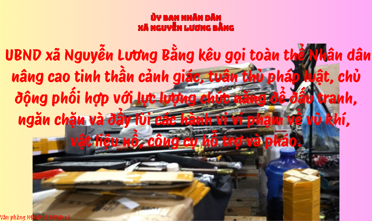 UBND xã Nguyễn Lương Bằng kêu gọi toàn thể Nhân dân nâng cao tinh thần cảnh giác, tuân thủ pháp luật, chủ động phối hợp với lực lượng chức năng để đấu tranh, ngăn chặn và đẩy lùi các hành vi vi phạm về vũ khí, vật liệu nổ, công cụ hỗ trợ và pháo.