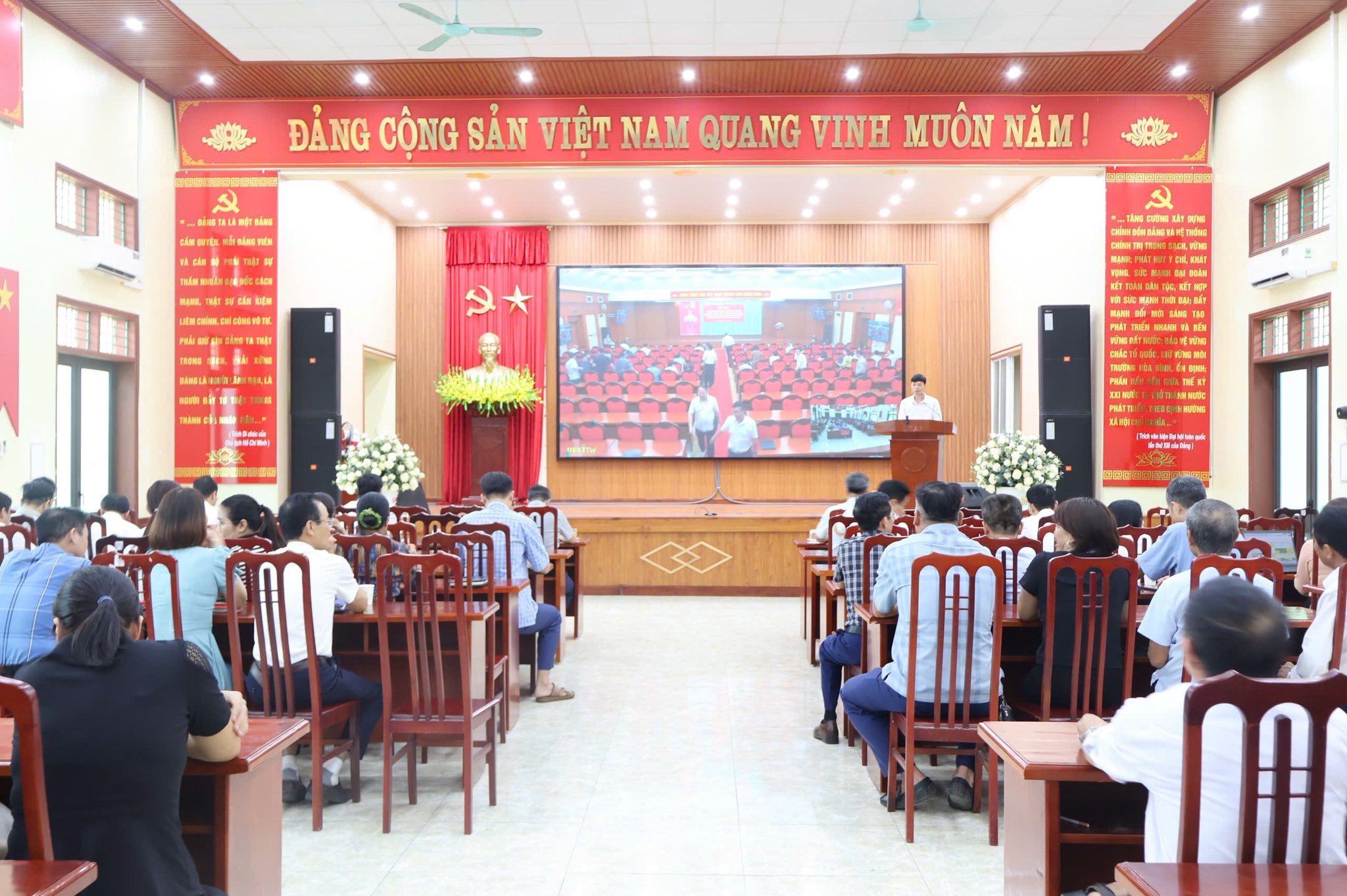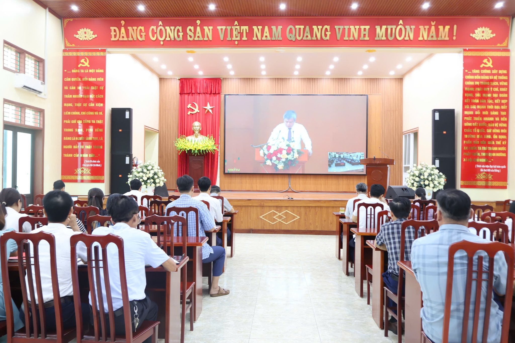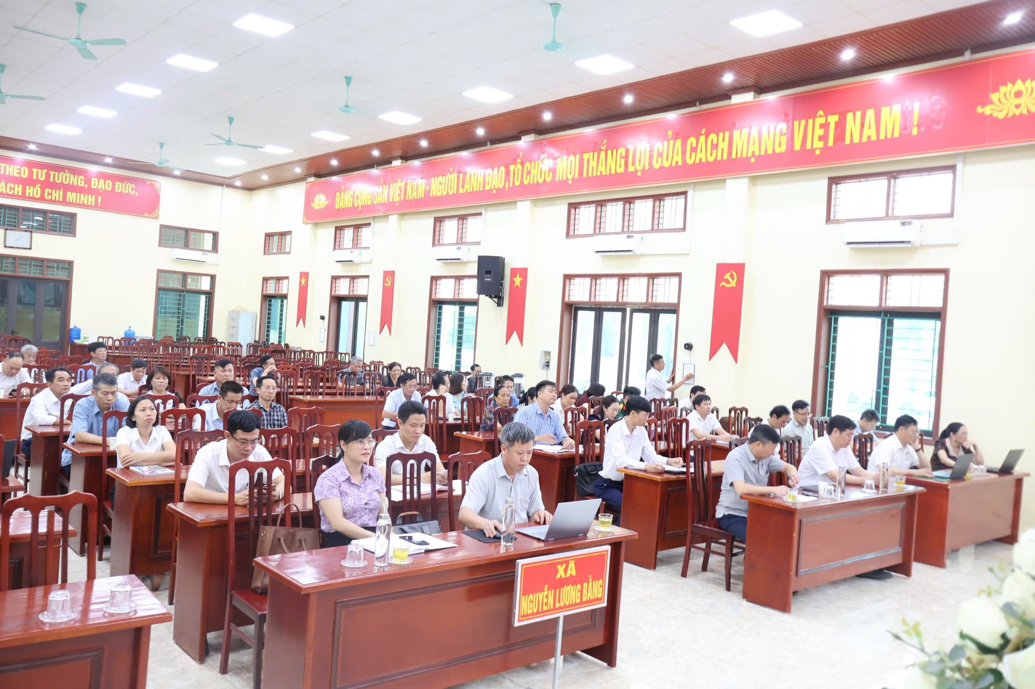 Ảnh toàn cảnh hội nghị Sáng ngày 22/4/2026, tại Nhà Văn hóa Trung tâm xã, Đảng ủy xã Nguyễn Lương Bằng tổ chức tham dự Hội nghị trực tuyến toàn quốc được kết nối từ điểm cầu Trung ương tại Hội trường tầng 11, trụ sở Cơ quan Ủy ban Kiểm tra Trung ương, đến các điểm cầu trong cả nước, nhằm quán triệt và triển khai các nội dung quan trọng của Đảng về công tác kiểm tra, giám sát và kỷ luật của Đảng trong giai đoạn mới.
