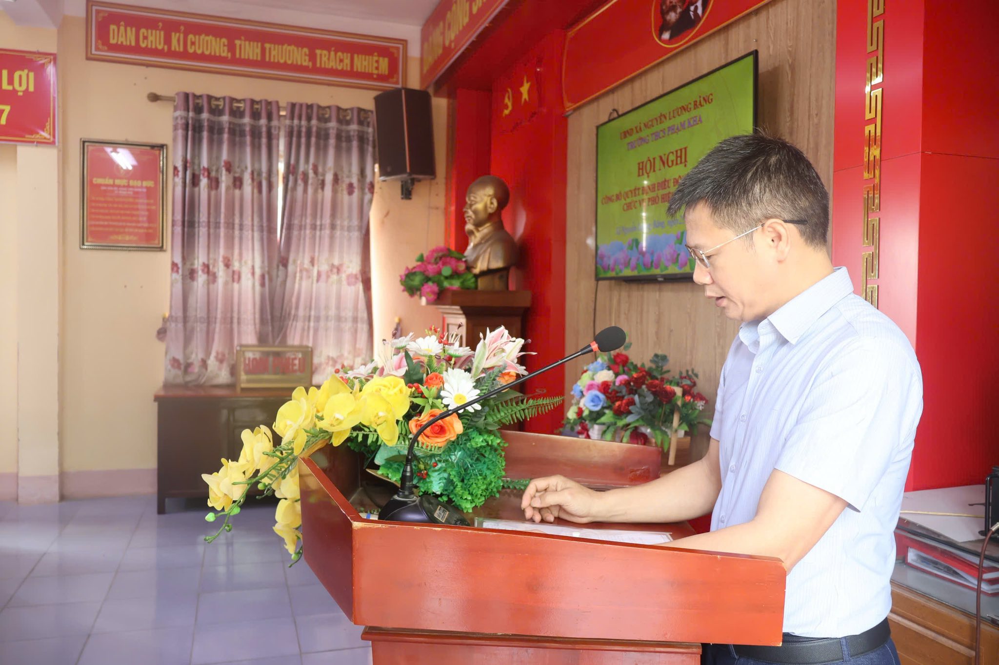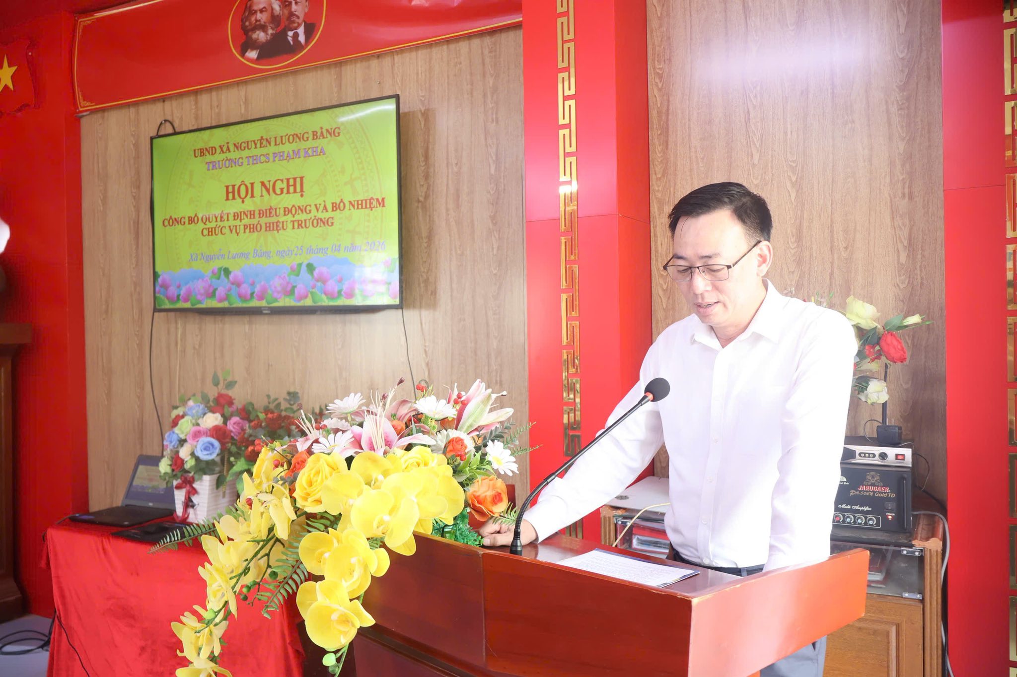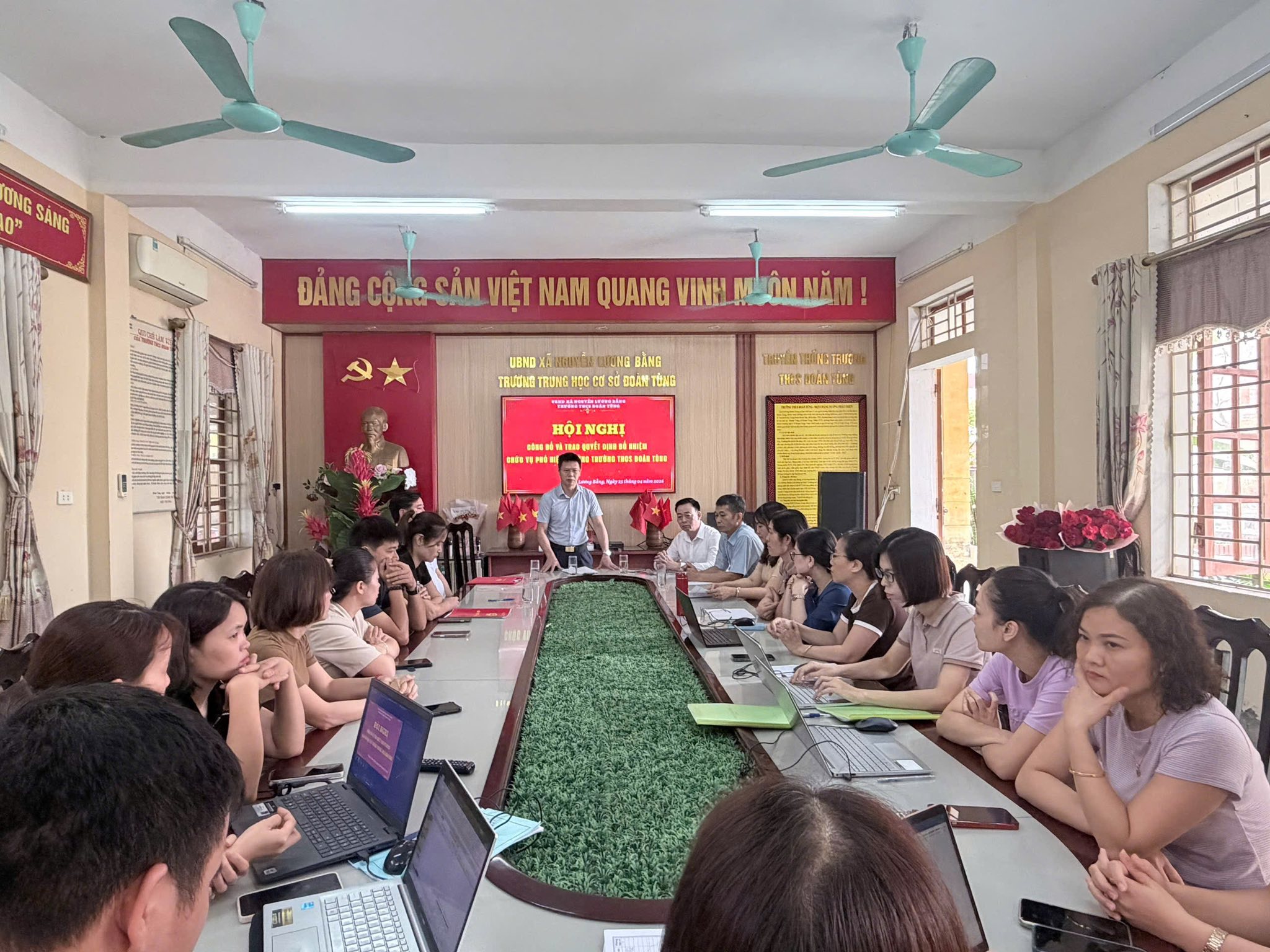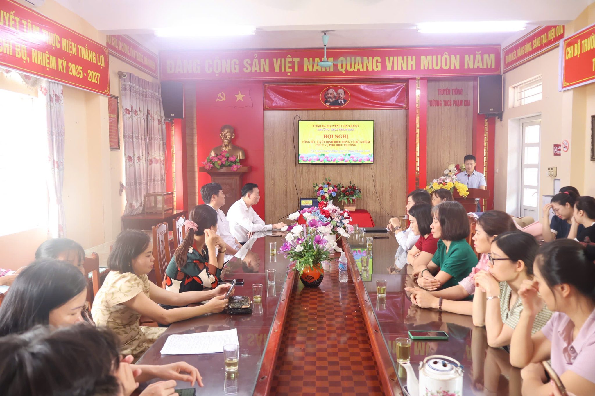 Quang cảnh hội nghị Sáng ngày 25/4/2026, tại Trường THCS Phạm Kha và Trường THCS Đoàn Tùng, UBND xã Nguyễn Lương Bằng đã tổ chức hội nghị công bố các quyết định về việc điều động, bổ nhiệm cán bộ quản lý đối với các trường trung học cơ sở trên địa bàn.