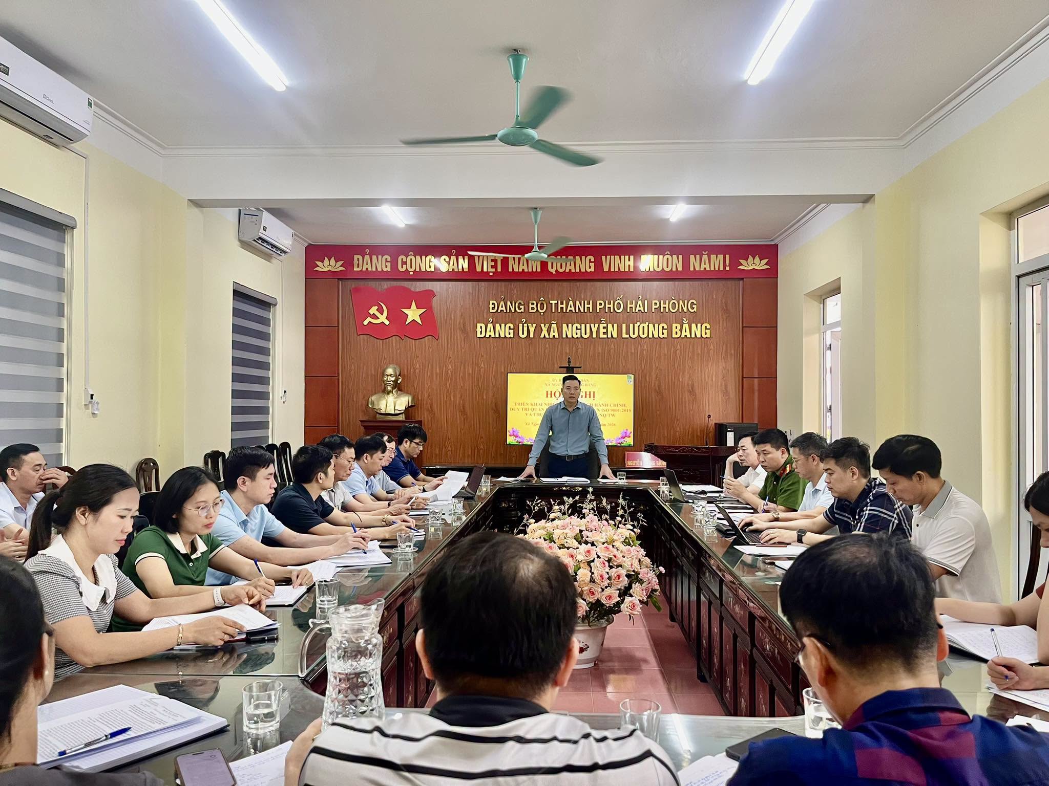 Nhằm tiếp tục nâng cao hiệu lực, hiệu quả hoạt động của bộ máy hành chính nhà nước ở cơ sở, chiều ngày 18/4/2026, tại Phòng họp Đảng uỷ, Ủy ban nhân dân xã Nguyễn Lương Bằng đã tổ chức Hội nghị triển khai nhiệm vụ cải cách hành chính (CCHC), duy trì và cải tiến hệ thống quản lý chất lượng theo tiêu chuẩn TCVN ISO 9001:2015, đồng thời quán triệt, triển khai thực hiện Nghị quyết số 57-NQ/TW trong tình hình mới.