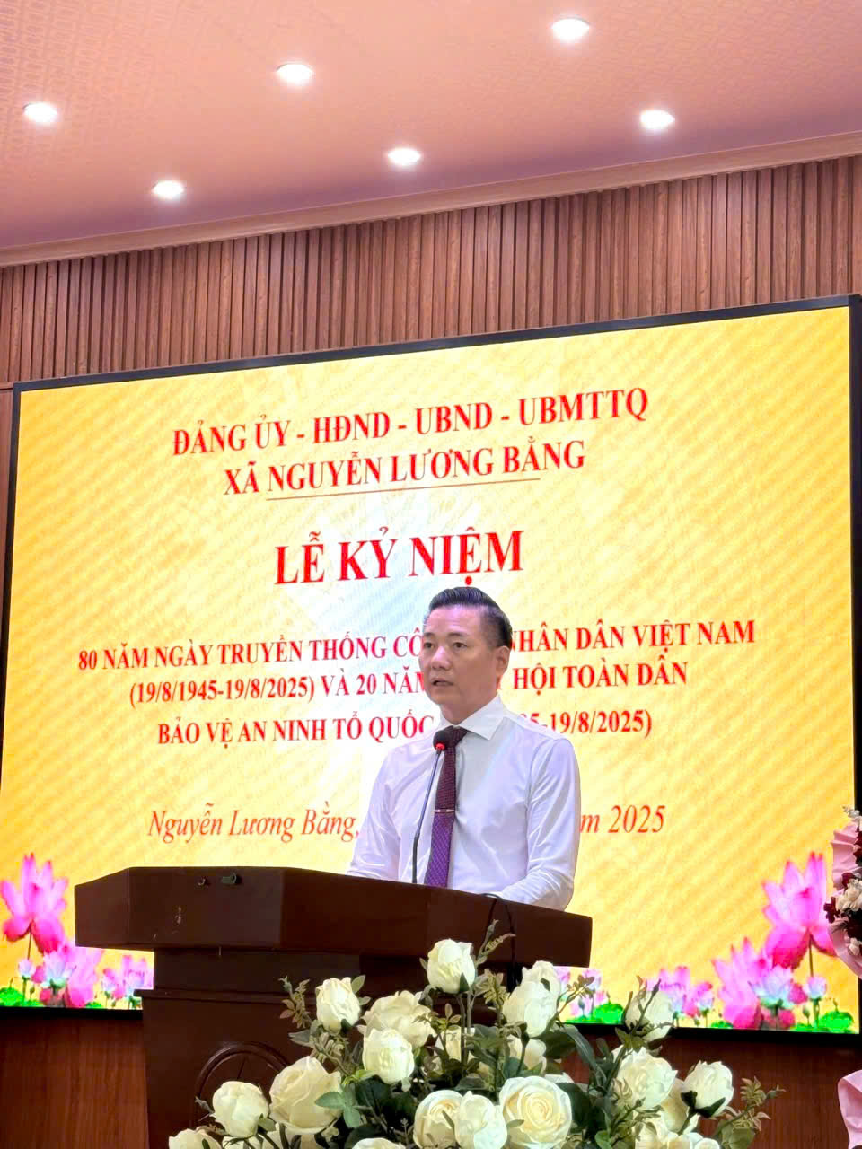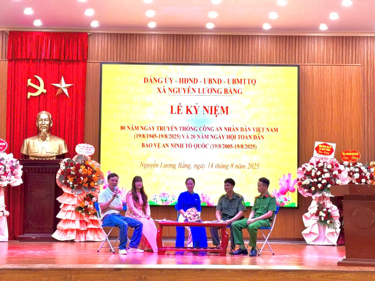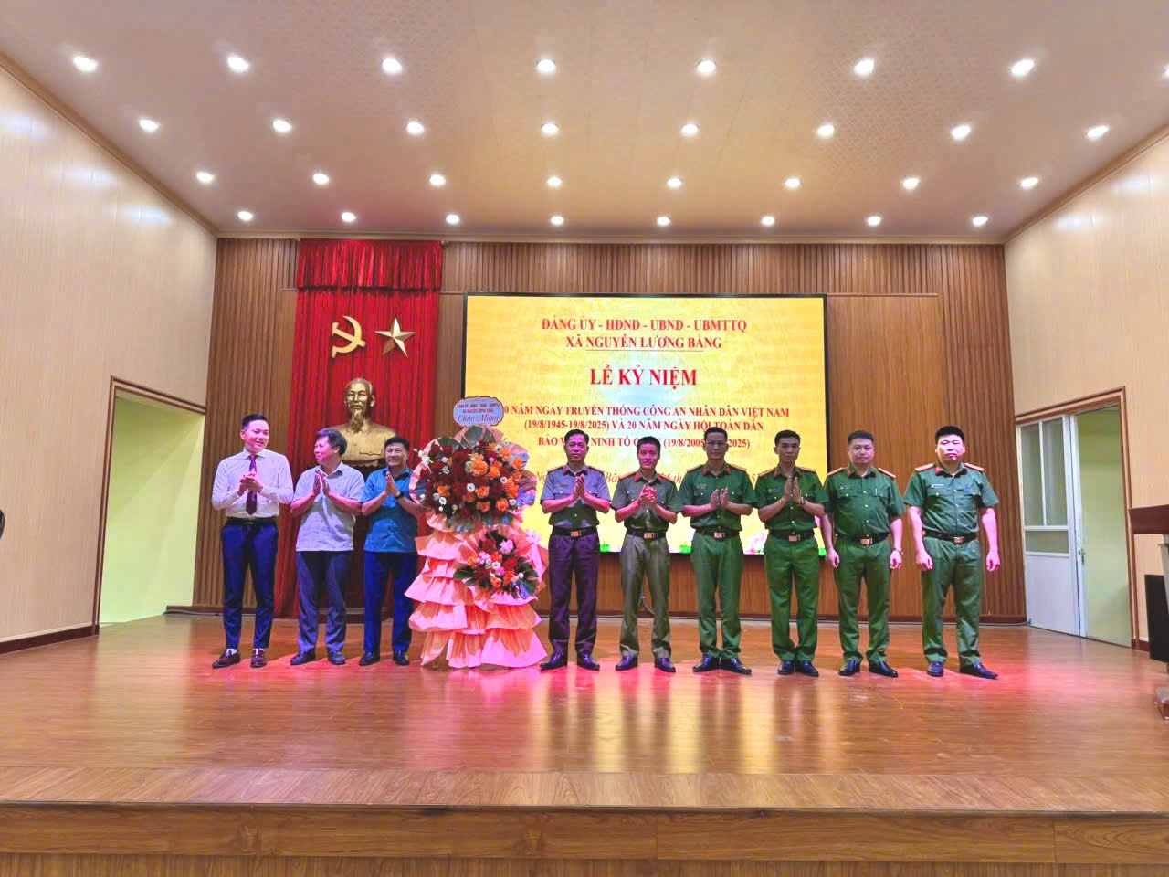 Chiều ngày 14/8/2025, tại Nhà văn hóa trung tâm xã, Ủy ban nhân dân - Công an xã Nguyễn Lương Bằng long trọng tổ chức Lễ kỷ niệm 80 năm Ngày truyền thống Công an nhân dân Việt Nam (19/8/1945 – 19/8/2025) và 20 năm Ngày hội toàn dân bảo vệ An ninh Tổ quốc (19/8/2005 – 19/8/2025).