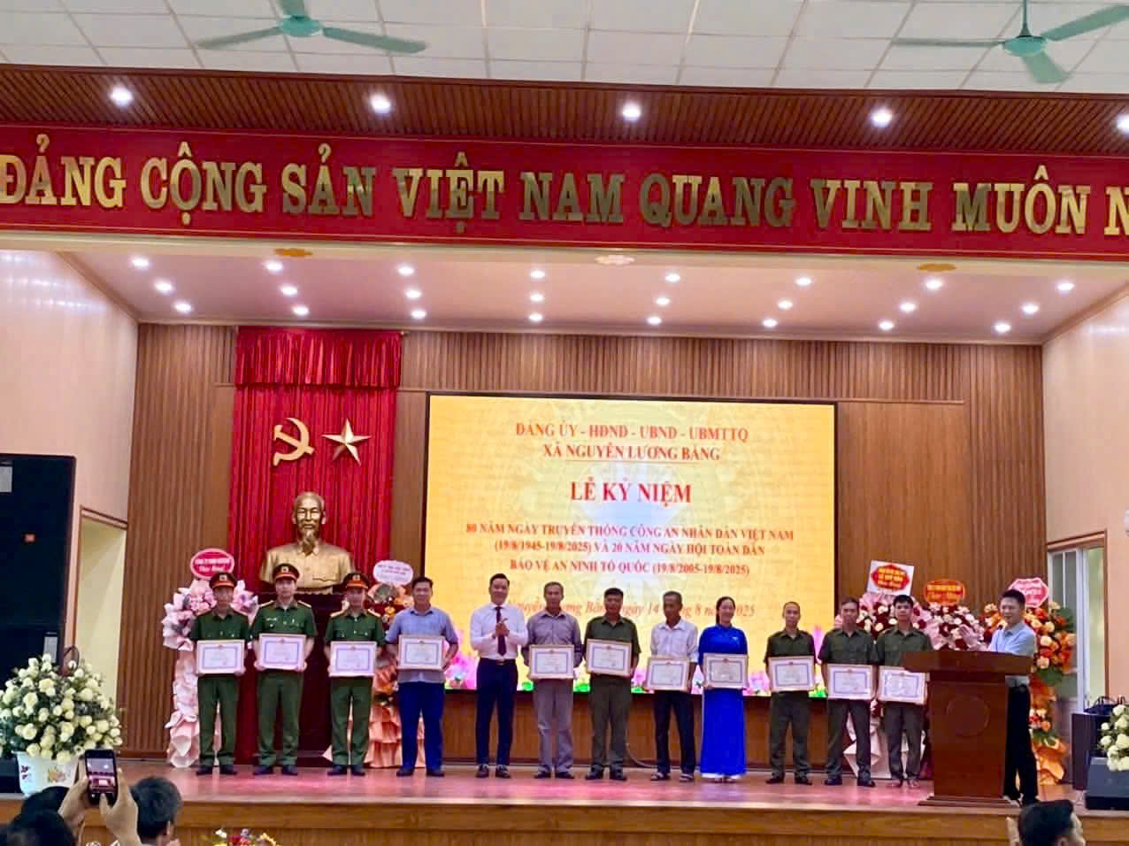 Nhân dịp này, UBND xã Nguyễn Lương Bằng đã biểu dương, khen thưởng các tập thể, cá nhân có thành tích xuất sắc trong phong trào toàn dân bảo vệ An ninh Tổ quốc; đồng thời phát động phong trào thi đua mới, kêu gọi toàn thể cán bộ, đảng viên và nhân dân tiếp tục phát huy tinh thần đoàn kết, tích cực tham gia bảo vệ an ninh, trật tự, xây dựng xã Nguyễn Lương Bằng an toàn, văn minh, giàu đẹp.